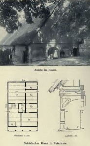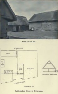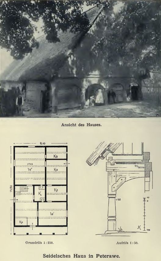 Das Seidelsche Gehöf ist das einzige in Peterawe, welches die ursprüngliche Anlage und Gestalt noch bewahrt hat. Sonst sind die meisten Gebäude des Ortes durch Ziegelbauten ersetzt. Das hübsche, 1829 errichtete Grisersche Haus neben dem Pfarrhause brannte im Oktober 1897 nieder. Es war ein Blockholzbau, dessen offene Halle sich aber auf die eine Ecke der Front beschränkte, wie in dem in Abbildung 3 gegeben Typus. Ein ähnliches Haus von sehr einfacher Ausbildung steht noch jetzt dem Seidelschen gegenüber.