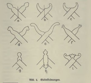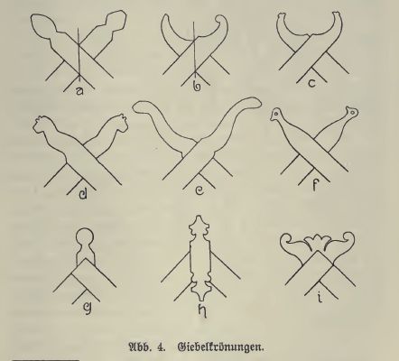 Ein leicht herzustellender Schmuck der alten Bauernhäuser sowie der Stallgebäude und Scheunen sind die Giebelkrönungen. Die Strohbedeckung des Daches erhält an den Giebeln einen Abschluss durch zwei Bretter, die dem letzten Sparrenpaar aufgenagelt werden. Gern ließ man am Firste die Enden der Bretter übereinander hinaustragen und schnitt sie zu Figuren aus. Die einfachste Gestallt ergab sich, wenn man die Bretter in einer geometrischen Form, einem Kreise, einem Vieleck oder einem Lanzett, endigen ließ (Abbildung 4). Zahlreiche Beispiele dieser Art sah ich im Kreise Ostrowo auf dem Wege von Groß-Wysocko nach Olobok. In Osiek bei Jutroschin fand ich dieses Motiv in die Köpfe zweier Hennen umgewandelt, die sich zum Angriff gegen einander wenden, die Hälse lang ausgereckt (Abbildung 4c).
