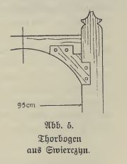 Ein Anderer Gegenstand, der die Lust zum Schmücken wach rief, war der Hofeingang. Jedes Gehöft hat zwei neben einander gelegene Eingänge, einen schmalen für Fußgänger und einen breiten für Wagen. Jenen überdeckte man zuweilen mit einem Riegelholze, gab den beiden Ständern eine schlichte freie Endigung und setzte zwischen dem Riegel und den Ständern zwei Kopfstücke ein, die man gemeinsam mit dem Riegel flachbogenförmig ausschnitt. Das in Abbildung 5 dargestellte Beispiel ist in Swierczyn bei Storchnest aufgenommen. Ähnliche Beispiele finden sich westwärts in dem Städtchen Schwetzkau.