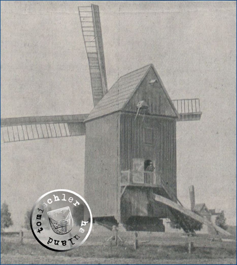 Das (untenstehende) Bild zeigt eine Windmühle, die von 1787 bis zum Jahr 1911 auf einem Sandhügel stand, dort wo heute die neue Winterschule steht, die zweitletzte der alten „Windböcke“ von Neutomischel, die in die Landschaft zu prächtig hineinpassen, aber modernen Maschinen zum Opfer fallen müssen. Über 100 Jahre hat man hier Korn gemahlen, und nach Abbruch der Mühle beim Ausschachten der Grundmauern für die Winterschule fand man nach Feststellung des Herrn Karl Eduard Goldmann, Neutomischel, einen prähistorischen Brennofen aus der Steinzeit.