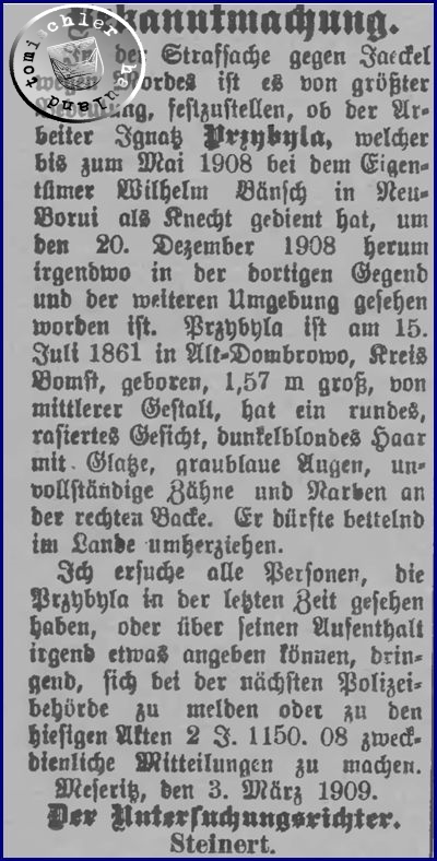 In der Strafsache gegen Jaekel wegen Mordes ist es von größter Bedeutung, festzustellen, ob der Arbeiter Ignatz Przybyla, welcher bis zum Mai 1908 bei dem Eigenthümer Wilhelm Bänsch in Neu Borui als Knecht gedient hat, um den 20. Dezember 1908 herum irgendwo in der dortigen Gegend und der weiteren Umgebung gesehen worden ist. Przybyla ist am 15. Juli 1861 in Alt-Dombrowo, Kreis Bomst, geboren, 1,57 m groß, von mittlerer Gestalt, hat ein rundes, rasiertes Gesicht, dunkelblondes Haar mit Glatze, graublaue Augen, unvollständige Zähne und Narben an der rechten Backe. Er dürfte bettelnd im Lande umherziehen.